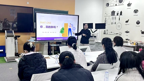“科学配比与实操创新”是本次实践课程的亮点。谈老师从理论课堂入手,从营养师的角度解析《中国居民膳食指南》,强调能量负平衡原则,分析了脂肪形成和分解的原因,总结归纳了减脂的4个因素。将营养学理论与烹饪实践结合,帮助教职工掌握吃出健康的核心技能。